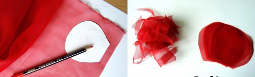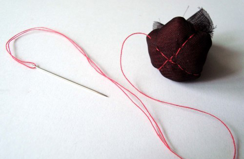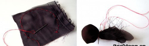 Մատիտով շրջանակ գծեք վրան և կարմիր թելով կարեք: Թելի ծայրը եթե քաշեք, փոքրիկ պարկ կստացվի, որը պետք է լցնենք ավելորդ շիֆոնով: Երբ կլցնեք շիֆոնը, թելն ավելի ուժեղ քաշեք և ամրացրեք: Գլխիկը կարեք: