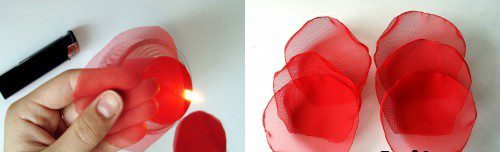 Վերցրեք նույն գույնի շիֆոնից երկար կտոր, այրեք ծայրերը և կարեք գլխիկի ներքևում: Կտրում ենք ավելորդ կտորն ու պահում կրակի վրա, որպեսզի հարթեցնի այդ հատվածը և տաքացնի, որ թերթիկները հեշտությամբ ամրանան գլխիկին: