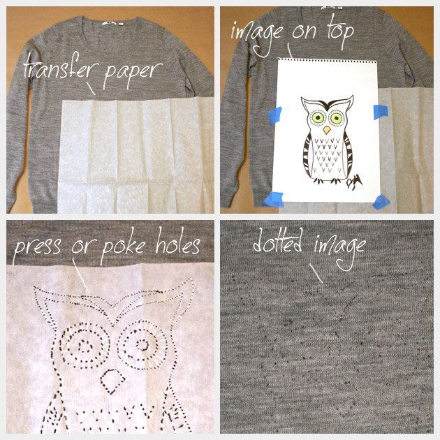 Եվ այսպես, բլուզի վրա դրեք կալկան, իսկ դրա վրա' նկարը: Նկարի բոլոր հիմնական գծերը ծակծկեք ու կետիկներ արեք: