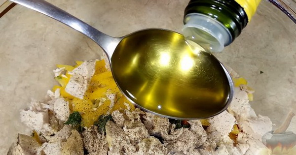 3. Հավի փափուկ միսը խաշում ենք, կտրատում մանր կտորների, խառնում: