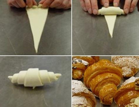 3․ Խմորը կտրատել եռանկյունների։ Եռանկյունու լայն հատվածում գդալով լցնել միջուկը, որից հետո զգուշորեն փաթաթել խմորը, որպեսի այն ստանա ապագա կրուասանի տեսքը։
