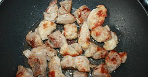 Խոզի միսը կտրատեք միջին մեծության կտորներով և բուսական յուղի հետ միասին լցրեք թավայի մեջ: Խառնելով տապակեք 30 րոպե, մինչև կտորները բոլոր կողմերից կտապակվեն: