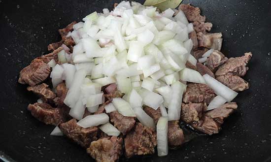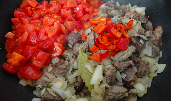 3. Կլպում ենք լոլիկը, կտրատում խորանարդիկներով: Մեկ կարմիր կծու պղպեղը մաքրում ենք կորիզներից և միջնապատերից, կտրատում: Լոլիկը և պղպեղն ավելացնում ենք մսի և սոխի վրա, 10 րոպե եփում։