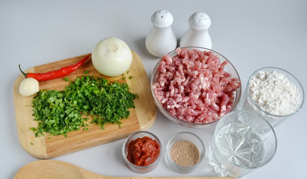 Ոչխարի միս՝ 500 գրամ Սոխ՝ 1 գլուխ Սխտոր՝ 1-2 պճեղ Կանաչիներ՝ ըստ նախընտրության (սամիթ, համեմ, կանաչ սոխ, մաղադանոս) Կծու պղպեղ՝ 0,5 հատ (չիլի) Տոմատի մածուկ՝ 80 գրամ Աղ՝ ըստ ճաշակի Աղացած սեւ պղպեղ՝ ըստ ճաշակի Գոլ ջուր՝ 150 միլիլիտր Թթմոր՝ 4 գրամ Աղ՝ 0,5 թեյի գդալ Ալյուր՝ 2-2,5 բաժակ։