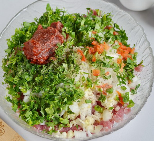 Պատրաստեք լիցքը: Դրա համար աղացած մսին խառնեք մանր կտրատած սոխը, սխտորը, կանաչեղենը, պղպեղը և աղ: Ավելացրեք տոմատի մածուկը: Ամռանը տոմատի մածուկը կարող եք փոխարինել թարմ, կեղևը հանած լոլիկով: