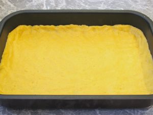 Հիմա անցնում ենք ամենակարևոր գործին: Ջեռոցի թավան յուղել, խմորը լցնել ու ձեռքերով հարթեցնել: