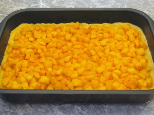 Բայց մի փոքր հատված խմորից առանձին պահեք. այն ձևավորման համար պետք է գալու: Վրան փռել կտրատած ծիրանը: