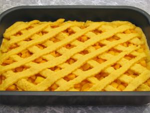 Այդ ավել խմորը գրտնակել, ձևավոր ատամներ ունեցող դանակով շերտատել և «ցանցապատել» ծիրանային շերտը: