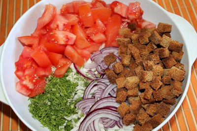 1. Հացի կտորները մանր խորանարդների ձևով կտրատել և ջեռոցում չորացնել: Չինական կաղամբը կտրատել շերտաձև, սոխը' կիսալուսնաձև, լոլիկը' խորանարդաձև: Կանաչին մանրացնել: Բոլոր մթերքները խառնել:
