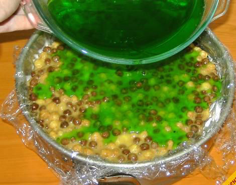 Հալեցնում եք կիվիի ժելեն, թողնում հովանա, մինչև կիսելի ոչ շատ խիտ թանձրության, հետո լցնում տորթի երկրորդ շերտի վրա: Դարձյալ դնում եք սառնարանում, թողնում, որ ամբողջովի դոնդողը կազմավորվի: