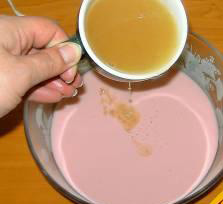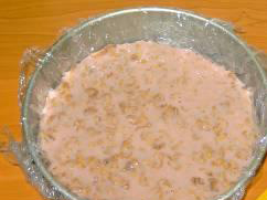 Ժելատինը բացում ենք տաք ջրով, թողնում 10 րոպե, հետո դնում կրակին, բայց չթողնելով եռալու աստիճան: Եթե ուզում եք տորթը գեղեցիկ լինի, ապա յոգուրտը վերցրեք երկու տարբեր գույների: Մենք ընտրել ենք ազնվամորի և արքայախնձոր: Վերցնում եք տարբեր ամաններ, լցնում յուրաքանչյուր գույնը մեկի մեջ և հալեցրած ժելատինը կիսում, լցնում երկուսի մեջ: