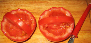 Լոլիկներից զամբյուղներ սարքել հասարակ դանակի օգնությամբ: Զգուշությամբ հեռացրեք միջուկը, բայց բռնակ թողեք, որպեսզի զամբյուղի ձև ստանա: