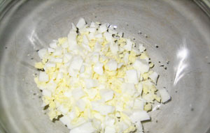 Ձուն խաշեք, մաքրեք և մանր կտրատեք: