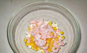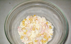 Ավելացրեք պահածոյացված եգիպտացորենը: Մանր կտրատեք ծովախեցգետնի ձողիկները և ավելացրեք մնացած զանգվածին: