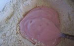 Ալյուրը խառնել 2 գդալ շաքարավազի հետ: Ցանկության դեպքում կարող եք ավելացնել նաև վանիլի փոշի: Ավելացրեք յոգուրտը (ցանկալի է ելակային) և խառնեք: