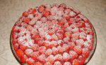 Մնացած 250գր հատապտուղը լվացեք և կիսեք երկու մասի: Տորթի շուրջը զրադարեք դրանով: Դրեք տորթը սառնարանում ևս 30-40 րոպեով: Մատուցելուց առաջ վրան ցանեք շաքարի փոշի: